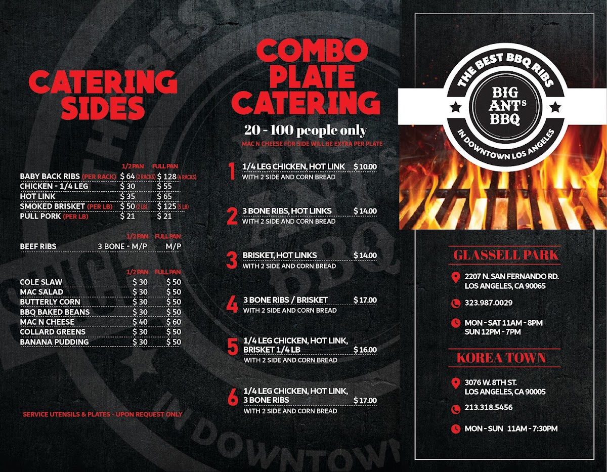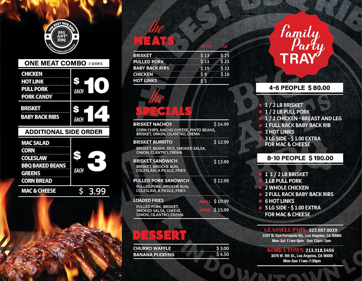 At Big Ant's BBQ, located at 2207 N San Fernando Rd, Los Angeles, CA 90065, the menu is a delightful blend of hearty barbecue dishes, tasty sides, and indulgent desserts that will satisfy any craving for comfort food. Whether you're stopping by for a quick bite or sitting down for a filling meal, there's something for everyone.